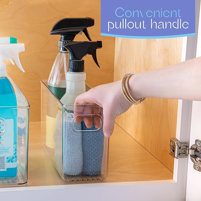 Plastic Food Storage 4 Pack Clear Container Bin with Handles for Organizing Kitchen, Pantry, Refrigerator, Freezer, Pantry, Cabinet, Closet, Bathroom. 10”x4”x6”