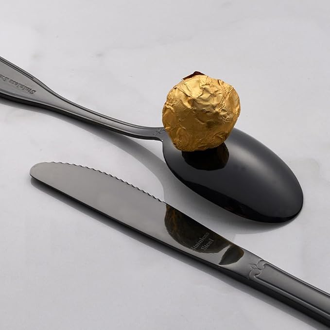 - Premium Stainless Steel: Our cutlery set is expertly crafted from high-quality stainless steel, ensuring durability and resistance to rust and corrosion. This matte black cutlery set not only guarantees long-lasting use but also maintains a polished shine, making it a reliable silverware set for everyday dining and special occasions alike