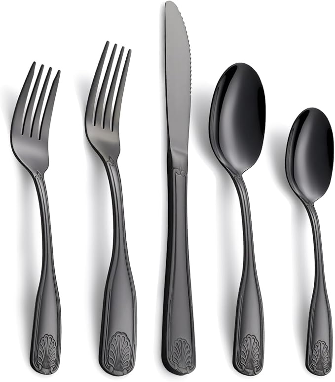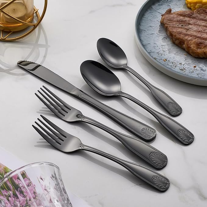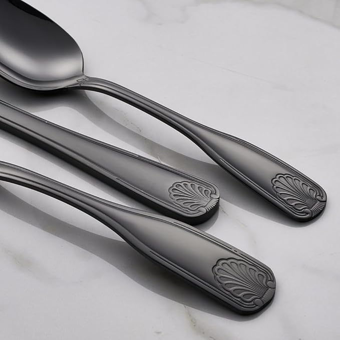 - Sleek and Stylish: The contemporary shell design on the handles of our black flatware set adds a chic touch to any kitchen tableware set for 4. This eye-catching design makes it perfect for both casual meals and elegant gatherings, ensuring your table always looks its best