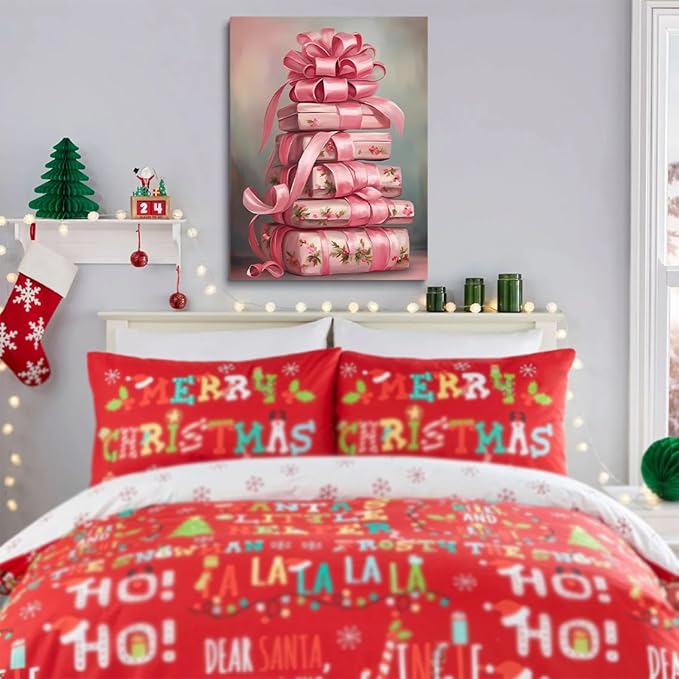 Pink Christmas Wall Art Pink Vintage Christmas Presents Canvas Print posters Retro Shabby Chic Christmas Printables Winter Home Decor 24x36 Unframed