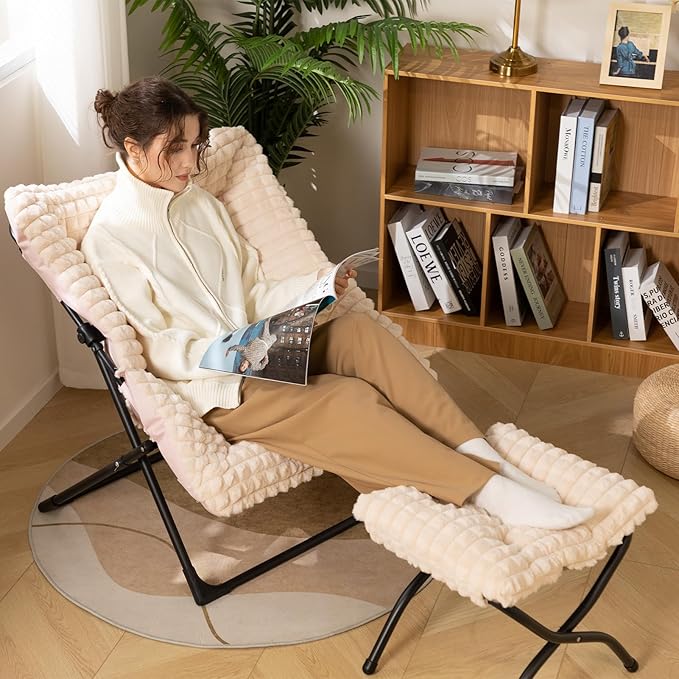HollyHOME X-Large Saucer Chair with Foldable Ottoman, Comfy Oversized Folding Chair and Folding Footrest Stool Set, Faux-Fur Reading Chair and Footstool for Living Room, Champagne Pink Chair&Stool