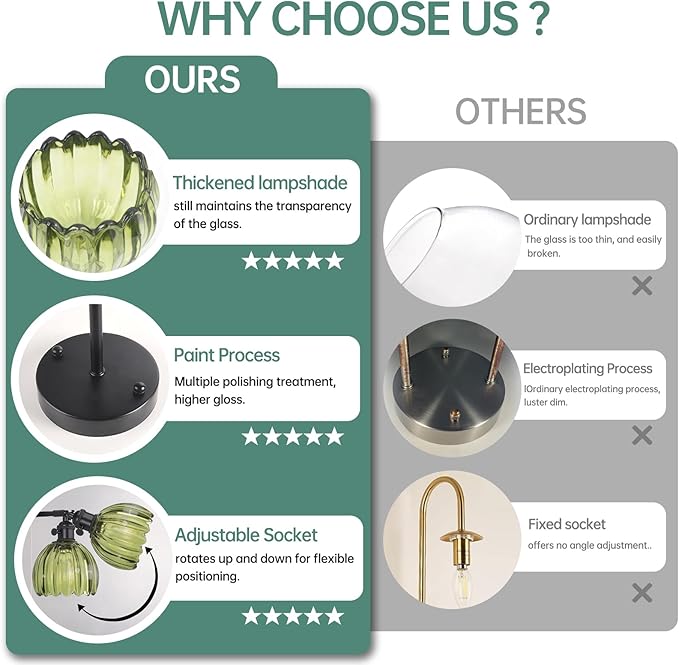 - 【Green Tone】Using classic green glass material, this color not only creates a nostalgic and retro atmosphere, but also brings a touch of vitality and energy to the indoor space. Green glass emits soft and warm light under the reflection of light, making people feel a sense of peace and comfort.