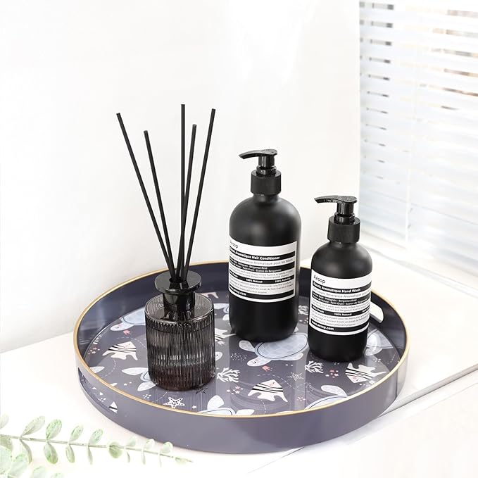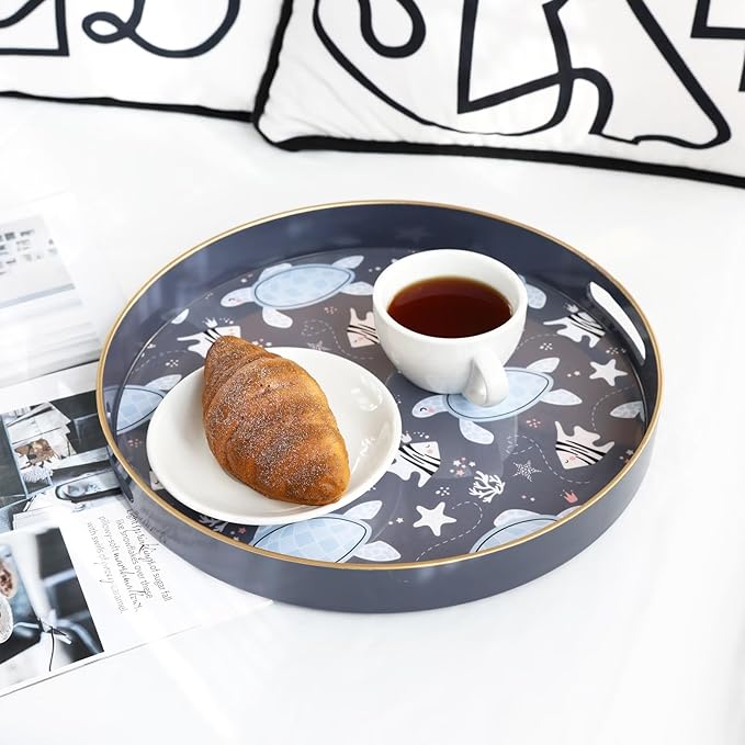 Spsyrine Decorative Serving Tray with Handles, Lacquered Coffee Table Tray for Ottoman, Round Waterproof Platters for Centerpieces, Parties, Living Room, Kitchen Counter Organization Turtle