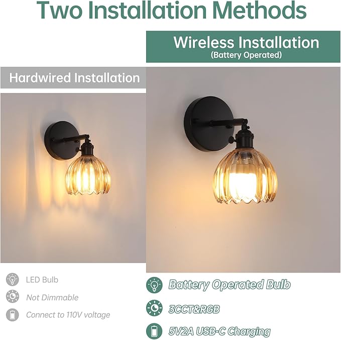Vintage Battery Operated Wall Sconce with Cute Amber Tulip Glass Lampshade Wireless Rechargeable Battery Powered Black Wall Light with Remote Control for Bedside Bedroom Doorway
