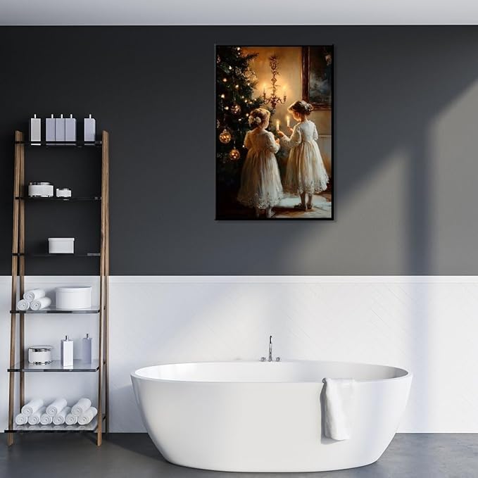 Vintage christmas wall art christmas tree wishing girl canvas poster winter room holiday decoration for farmhouse cabin living room bedroom black framed12x18inch