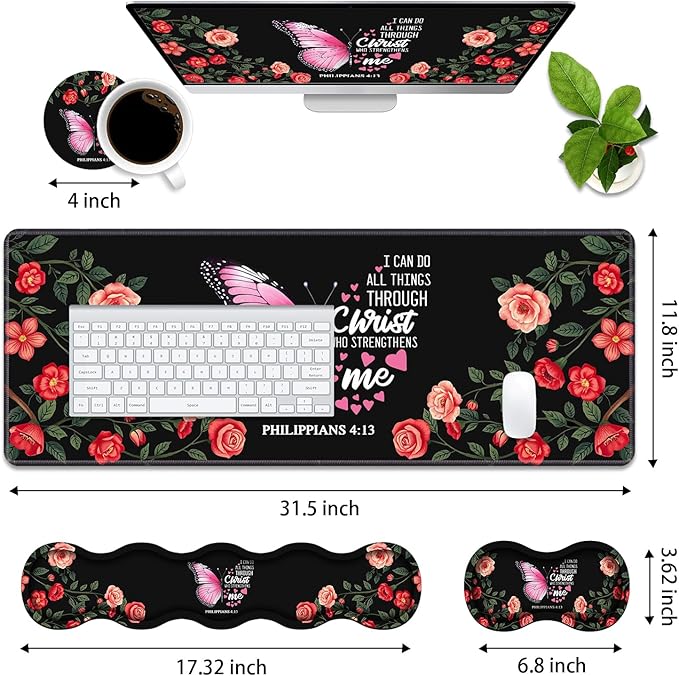 Ergonomic Memory Foam Mouse Pad Wrist Rest Set, Large Desk Pad + Keyboard Wrist Rest + Mouse Wrist Cushion + Coaster for Home Office Study Gaming, Floral Butterfly Quotes Bible Verse Philippians 4:13