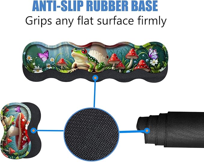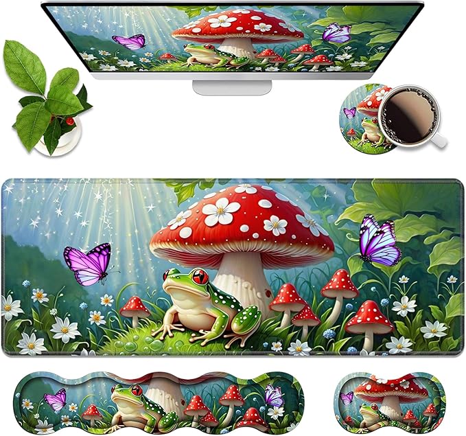 4 in 1 Ergonomic Memory Foam Mouse Pad Wrist Rest Set, Large XXL Gaming Desk Pad + Keyboard Wrist Rest + Mouse Wrist Cushion + Coaster for Home Office Study Gaming, Frog Mushroom Butterfly