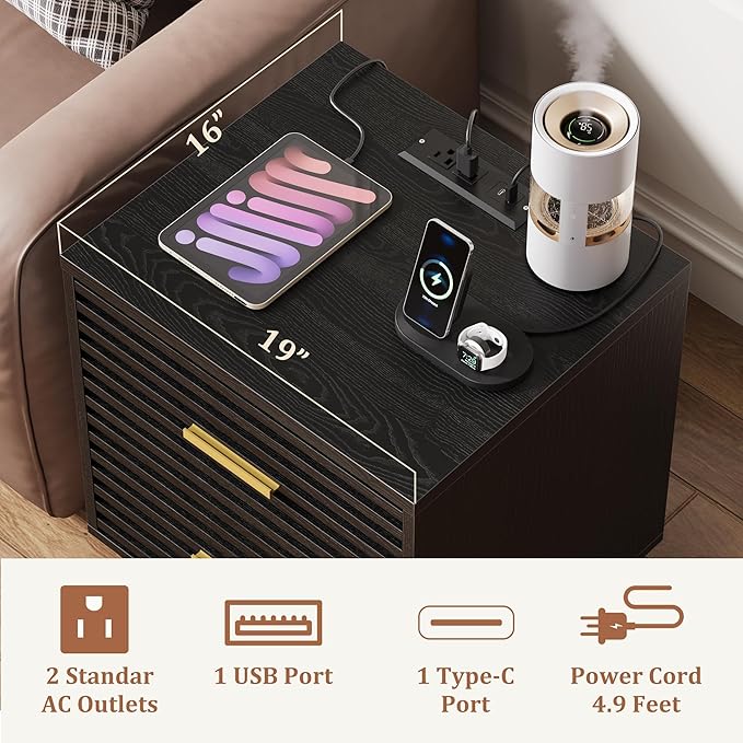 - [Nightstand with Outlets]Overall Dimension: 19”(L) X 16”(D) X 24”(H). This night stand equipped with 2 AC outlets, 1 USB port, and 1 USB-C port, enables to charge mobile devices such as mobile phones, keyboards, headsets, desk lamps, and other appliances at any time. No more hunting for a spot to charge devices. This mid century modern nightstand is a little piece of art at home. You can match this end table with our mid century TV stand