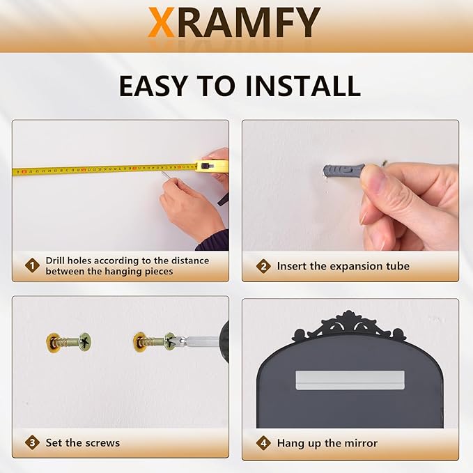 - Wall Mirror: This lightweight hanging mirror comes with all the necessary mounting hardware for quick and hassle-free installation. Simply secure the included screws into your desired location to ensure the wall-mounted mirror stays firmly in place for long-term stability. The decorative top piece can be easily attached or removed, allowing you to customize the mirror's look to match your personal preference