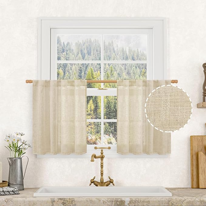 LAMIT 24 Inch Cafe Linen Curtains for Kitchen Window, Semi Sheer Light Filtering Short Curtains Back Tab and Rod Pocket Neutral Drapes for Bathroom/Basement, 2 Panels, Linen, 34 x 24 Inch