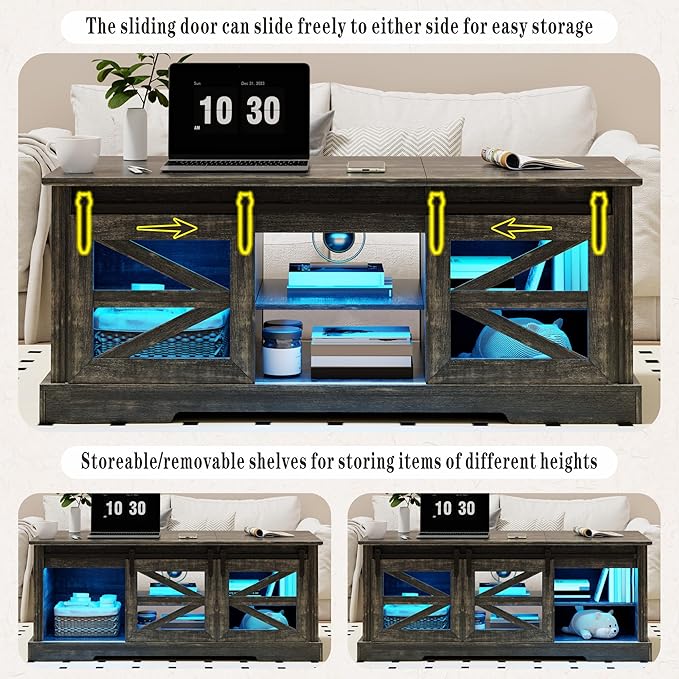 - [Large storage space]: 21.7D*47.3W*19.7H inches, this farmhouse coffee table has two cabinets and a central open storage compartment, and is equipped with sliding barn doors. The layers of storage compartments on both sides can be detachable to place items of different heights, effectively storing and enhancing the beauty of the space