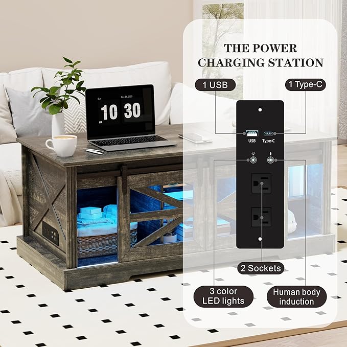 - [Convenient multi-functional coffee table]:A powerful charging station, 1 USB and 1 Type-C, 2 sockets, also equipped with blue, yellow, white 3 colors LED light and human sensor. Open the light switch, continue to click the button to switch different lights, long press to adjust the brightness of the lamp; Human sensor light: open the light switch, and then light the human sensor button, when the person is near, the light will automatically light up, when the person leaves, the light will automatically go out. Do not want to use the human body sensor light, you can click the button to turn off