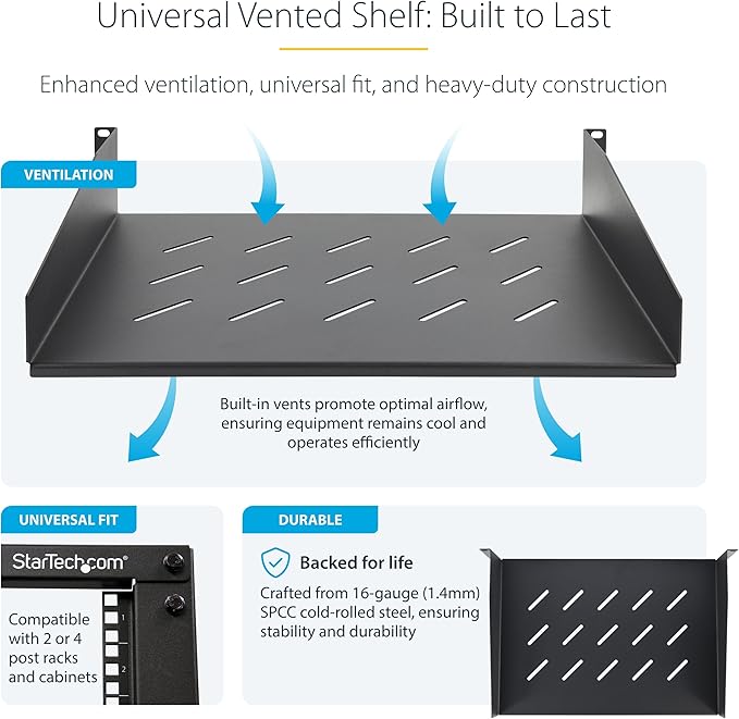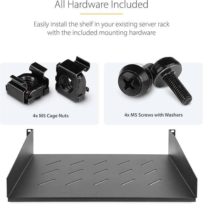 - UNIVERSAL 19'' FIT: 2U vented rack-mount shelf is designed to fit EIA-310-compliant 19-inch server racks or cabinets; Mounting depth of 12.4 inches (31.5cm) for data, IT, networking, or non-rack mountable equipment