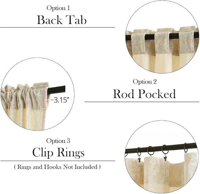 - 3 HANGING OPTIONS: There are 3 methode for you to choose to hang those curtains, the back tab ,rod pocket or using the hook. You can easily switch between the three hanging methods to create different looks. Package includes one pair of 52 by 84 inch curtains and 2 matched tie backs (hooks are not in package).