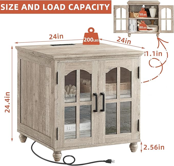 Farmhouse End Table with Charging Station,24" Large Sofa Side Table with Glass Barn Door,Rustic Wood Night Stand with Adjustable Storage Shelf,Square Bedside Table for Living Room,Bedroom Office