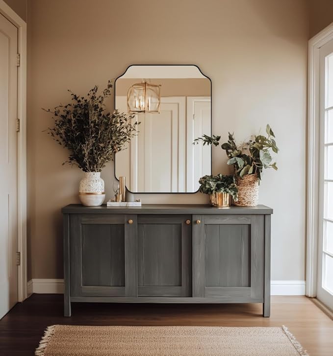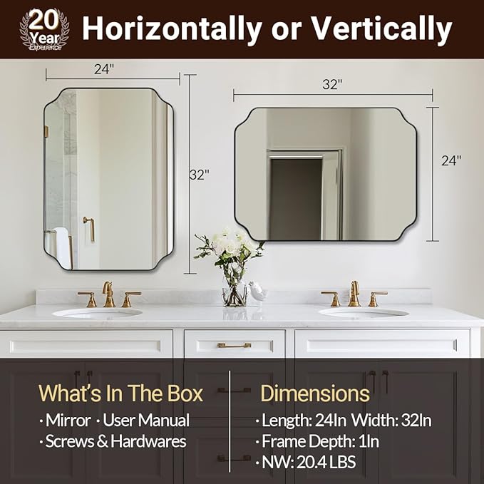 - 【Easy and Secure Installation】: 4 pre-installed D-Rings, along with all necessary hardware and clear installation instructions, ensure a hassle-free setup process. For any missing hardware, reach out to us for prompt assistance. Due to its weight(20.4 lbs), we recommend having 2 people install this heavy black vanity mirror