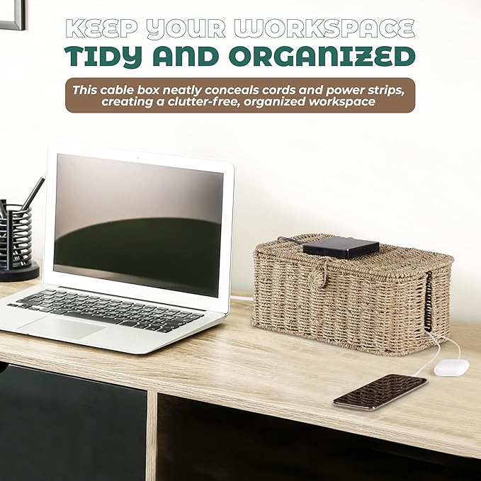- π¬οΈ Naturally Breathable Design: Handwoven with natural Cyperaceae fibers, the entire body of this cable organizer box offers excellent airflow. This naturally ventilated structure prevents overheating of power strips and chargers, ensuring safe and efficient use for your electronic devices..