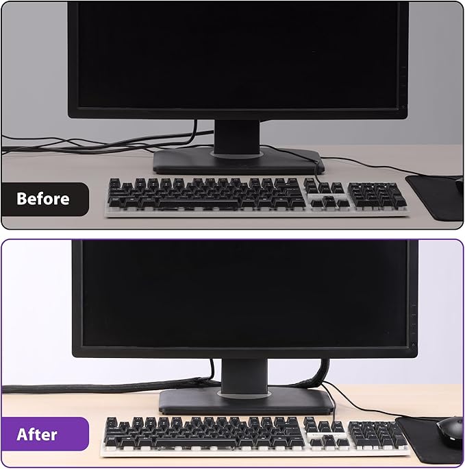 - Flexible & Talented Material: The wire management sleeve is made of high-density PET, with a working temperature range of -50°C to +150°C and a melting point temperature of 240°C ± 5°C. It is highly wear-resistant, and safe. The wire wrap also has the highest flame retardant rating: UL94 V-0, ensuring durability. Environmental class: ROHS, no chemical odor and reliable.