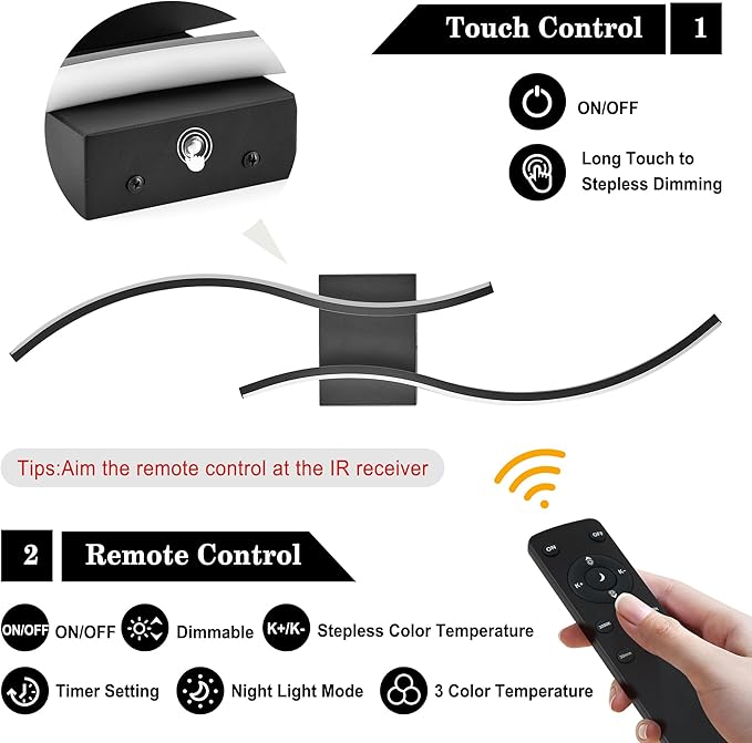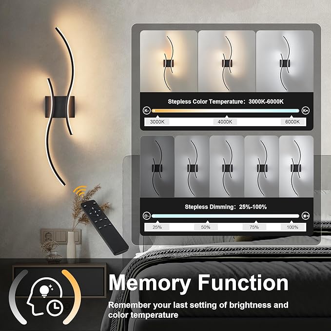 - Adjustable Colors & Brightness,Memory Function: You can choose different color temperature modes (3000K-6000K) through the remote control according to your needs, and adjust the brightness you want (20%-100%) . The color temperature and brightness can be infinitely adjusted. Memory function can remember your last color and brightness setting. So you don't need to adjust the color and brightness every time.In addition, the remote control also comes with a night light and timing function, allowing you to read without disturbing your partner's sleep
