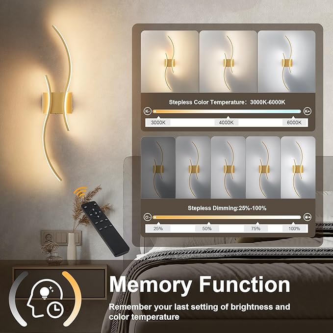 - Adjustable Colors & Brightness,Memory Function: You can choose different color temperature modes (3000K-6000K) through the remote control according to your needs, and adjust the brightness you want (20%-100%) . The color temperature and brightness can be infinitely adjusted. Memory function can remember your last color and brightness setting. So you don't need to adjust the color and brightness every time.In addition, the remote control also comes with a night light and timing function, allowing you to read without disturbing your partner's sleep
