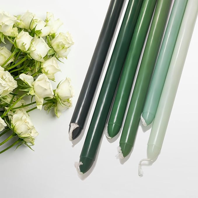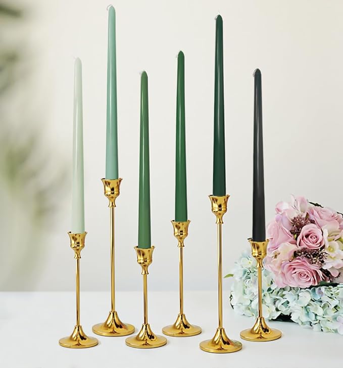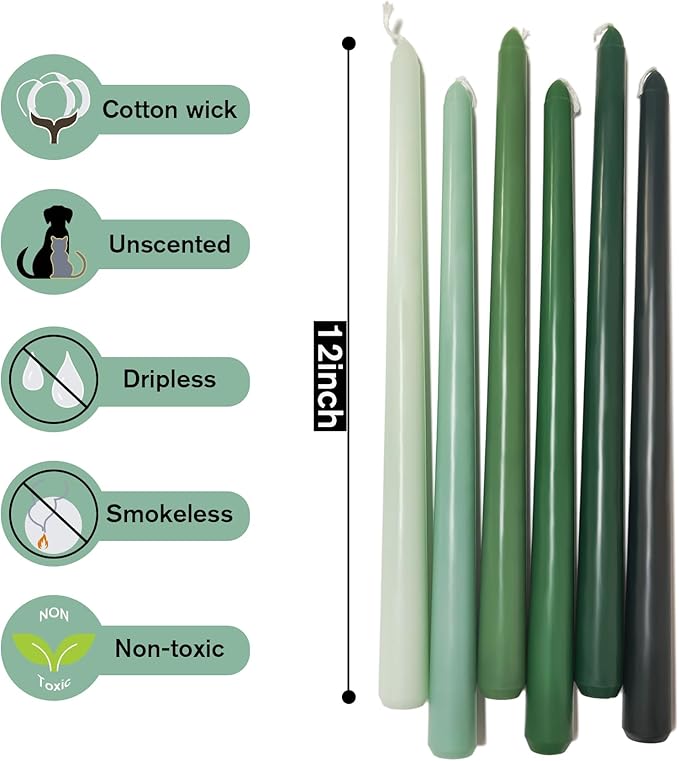 - LUXURY MORANDI-GRADIENT COLORS TAPER CANDLES: Pack include 6PCS taper candles are decorated in a modest luxury green hue color scheme, these colorful taper candles adding an elegance and style to your dinner table, home decor or wedding decor. From intimate home dinners to grand events, the gradient candles will captivate your guests and make a lasting impression