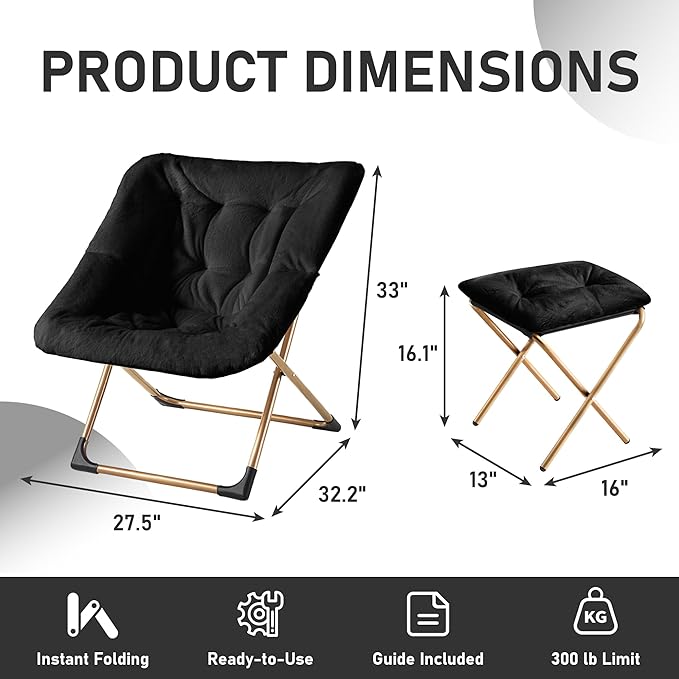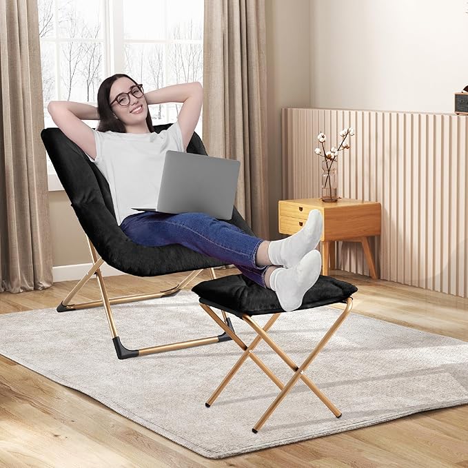 Comfy Oversized Saucer Chair with Ottoman,Soft Faux Fur Reading Lounge Chair for Adults,Stable X-Large Metal Frame and Non-Slip Pad,Cozy Chair for Bedroom, Living Room, Dorm, Office, Black