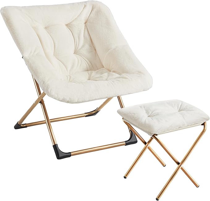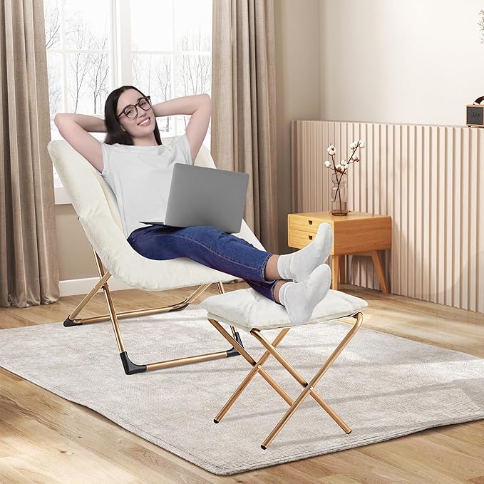 Comfy Oversized Saucer Chair with Ottoman,Soft Faux Fur Reading Lounge Chair for Adults,Stable X-Large Metal Frame and Non-Slip Pad,Cozy Chair for Bedroom, Living Room, Dorm, Office, Beige