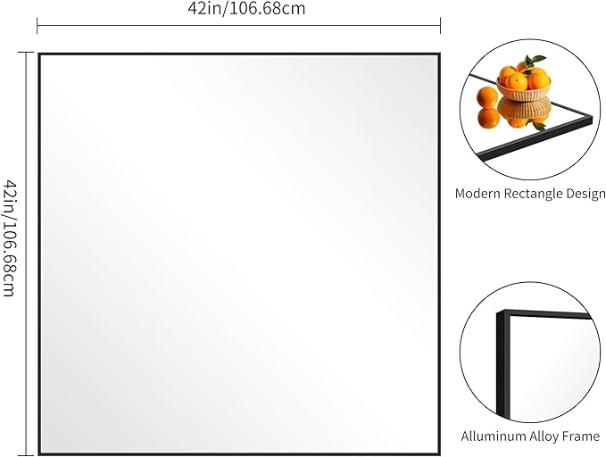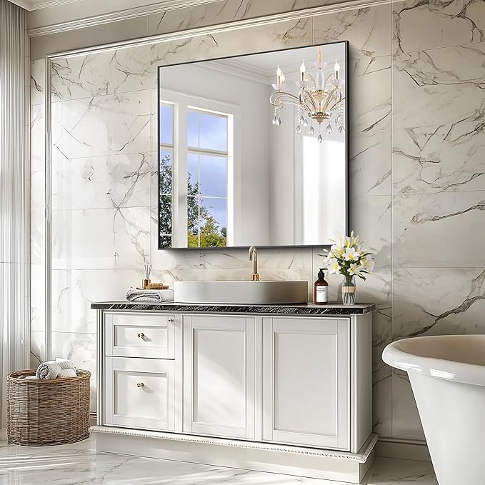 Black Bathroom Mirror for Wall, 42x42 Inch Wall Mounted Rectangle Mirrors with Metal Frame, Large Modern Vanity Wall Square Mirror for Bathroom Living Room, Entryway