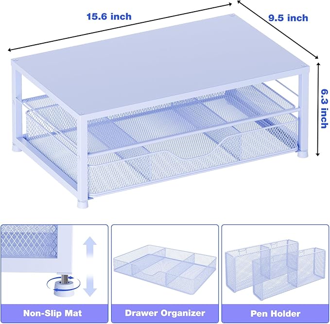 - 【Save Space】:This 2-Tier monitor stand with drawer and 2 hanging pen holders provides ample storage space to keep your office supplies and office desk accessories neatly organized and easily accessible, keeping your workspace tidy and improving your sense of well-being