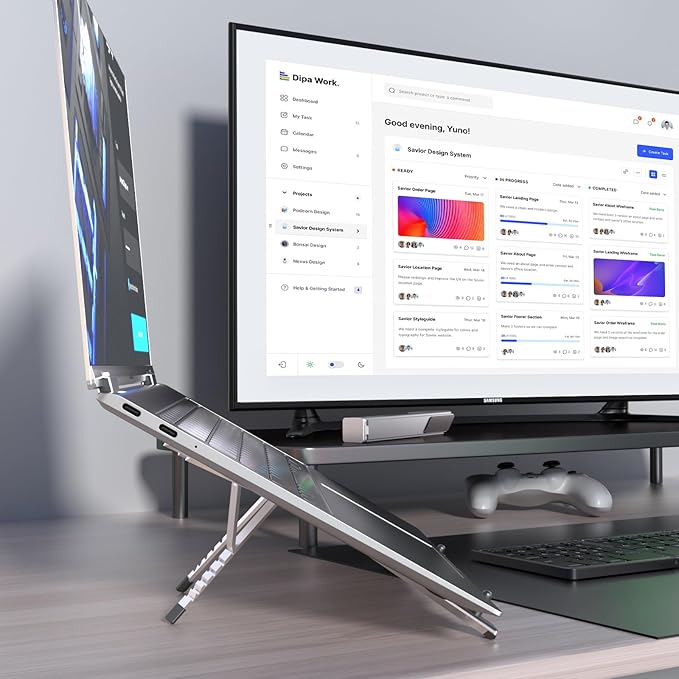 - Exquisite Workmanship: Premium Aluminum Laptop Stand with Anti-Slip Rubber Pads - Sleek MacBook Holder with Polished Surface and Device Protection, Ergonomic Laptop Riser/Portable Laptop Stand Perfect for All 10-17.3 inch Devices