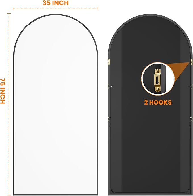 - Wall mirror has a classic arch shape with a shatterproof design. It can be hung on the wall or stand on the floor and is suitable for a variety of home styles such as modern classical boho. Product size is 75" x 35''.