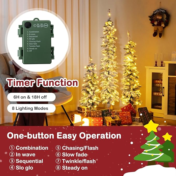 GOFLAME Set of 3 Pre-Lit Potted Christmas Trees, Snow Flocked Pencil Christmas Tree Set 3Ft, 4Ft and 5Ft with Warm White LED Lights, 8 Lighting Modes, Timer, Holiday Decoration Tree for Home Party