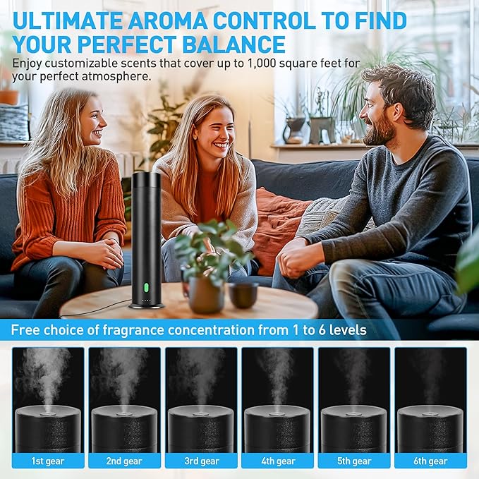 - Vast Coverage with Customizable Scent Levels: Experience long-lasting and consistent scent coverage of up to 800-1,000 square feet. With six adjustable fragrance intensities, you can easily customize the fragrance concentration to suit your mood. Choose the scent strength that suits you best to create the perfect atmosphere