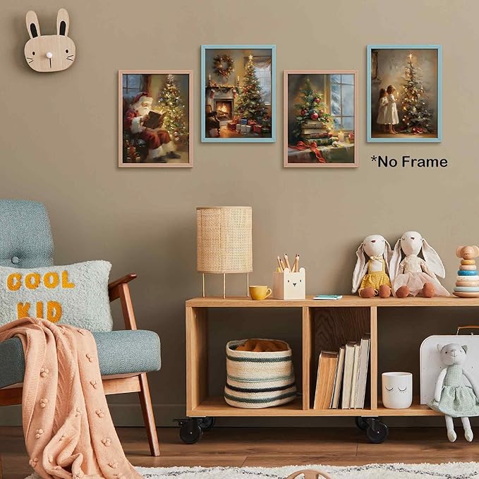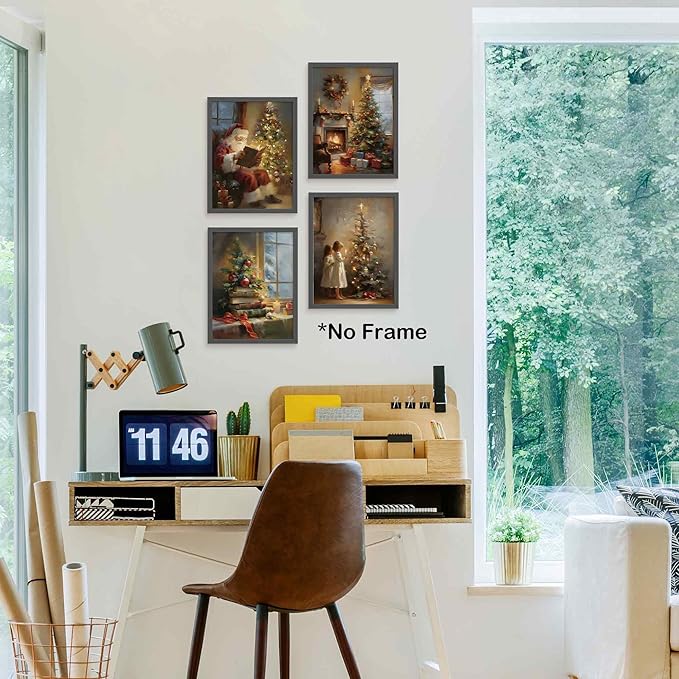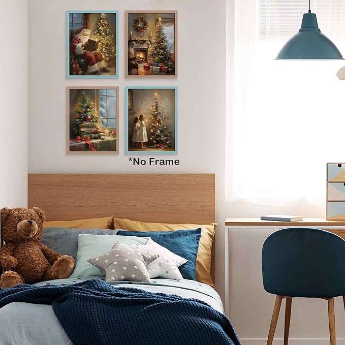 TLESKE Vintage Winter Christmas Posters Prints Unframed Set of 4, Rustic Christmas Tree Wall Art Prints Decor for Living Room Bedroom Reading Nook Corner, Santa Claus Books Wall Pictures, 12x16 Inches