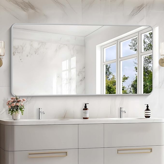 - MODERN STYLE SILVER BATHROOM MIRROR: The dimensions of this bathroom mirror is 60 x 30 inch, perfect size for you to get a true and reliable images at multiple angles and distances. Designed minimalist modern style combine practicality and aesthetics. Suitable for anywhere a mirror might be needed. Such as bathroom, cloakroom, dressing room, living room, bedroom, entryway, over sinks. Bring more style and brightness to your home. It's also a wonderful housewarming gift for friends and families.