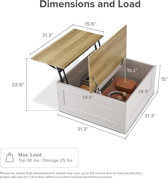 - Dimensions: 31.3 (W) x 31.3 (D) x 15 [closed], 22.6 [lift-top extended] (H) inches; 1-year warranty