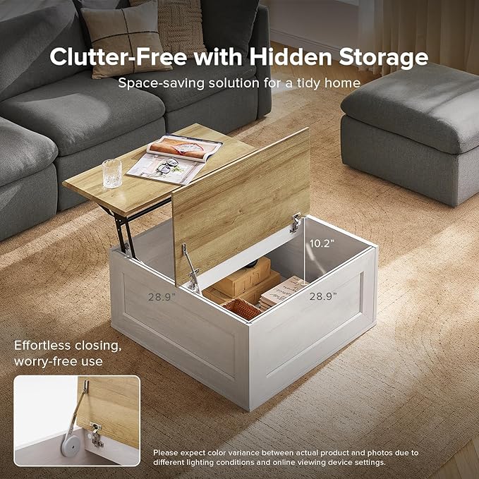mopio Blake Lift Top Coffee Table with Storage, Modern Farmhouse Square Wood Center Coffee Table with Easy Lifting Top, Chamfered Edge & Soft Closing (White Oak)