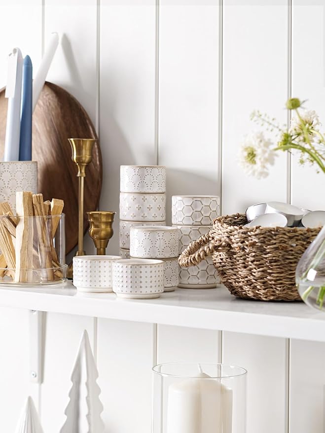 - Embossed Design: With classic white ceramic decorated in expressive embossment, these small candholders shaped to fit every corner of the room are an elegant and eye-catching choice for bedrooms, living rooms, and dining tables. Exquisite farmhouse style candle holders bring soothing and beauty to your daily life. Whether or not you put candles inside, they are your unique decorative piece