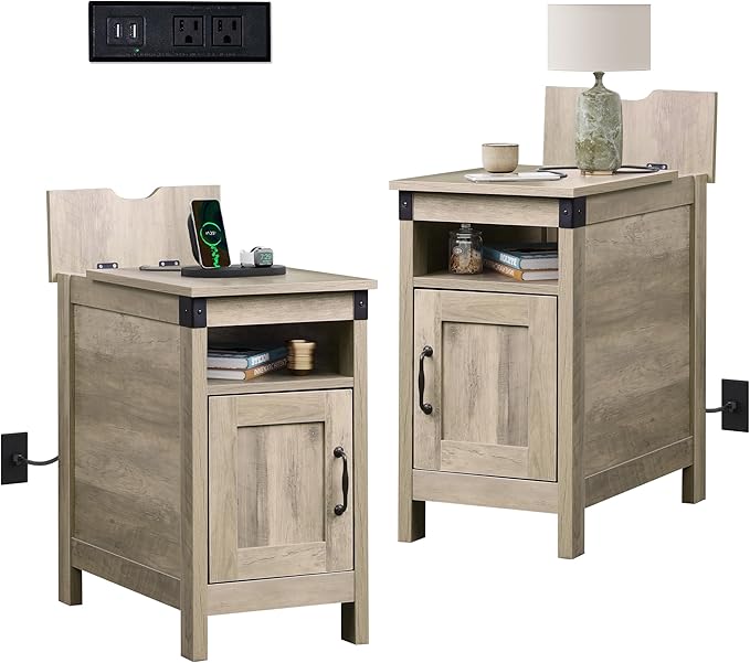WLIVE Farmhouse End Table Set of 2 with Charging Station, Narrow Side Tables Living Room, Bedroom, Couch with USB Ports and Outlets, Wood Nightstand Sets with Storage, Greige