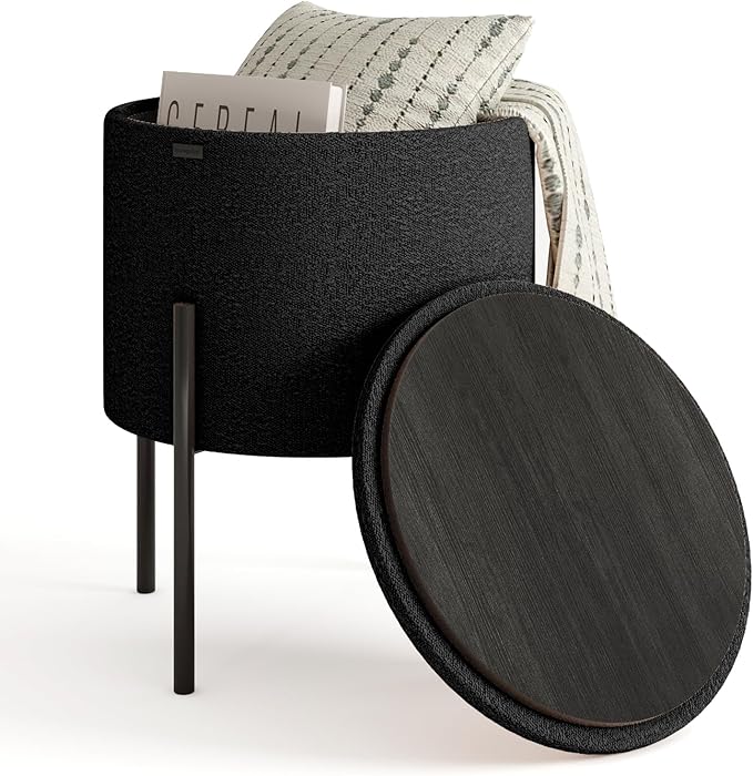 - Black Storage Ottoman: Elevate your home decor with StorageBud’s Round Black Ottoman with Storage, featuring plush boucle upholstery, spacious inner storage, and a dual-sided lid for multipurpose use as a footstool, foot rest, or side table.