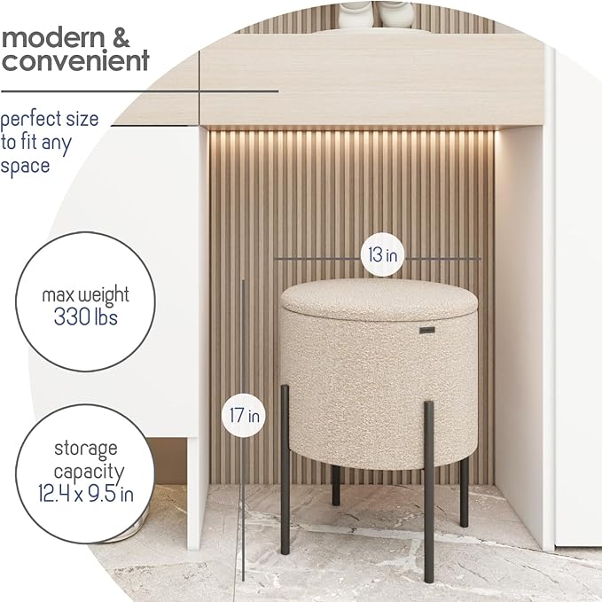 - Dual-Sided Lid: Flip the top of this boucle ottoman chair to switch between a soft padded seat or sturdy wooden table. This round storage ottoman stool is 17” H x 13” D and supports up to 330 lbs, with solid construction and sturdy iron legs.