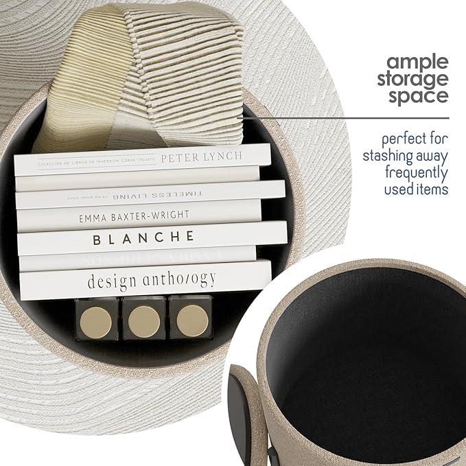 - Beige Storage Ottoman: Elevate your home decor with StorageBud’s Round Beige Ottoman with Storage, featuring plush boucle upholstery, spacious inner storage, and a dual-sided lid for multipurpose use as a footstool, foot rest, or side table.