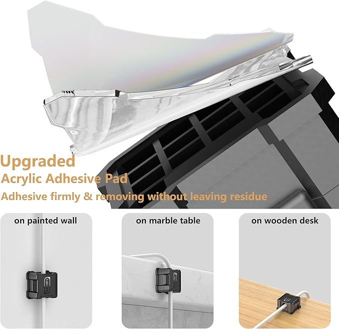 - 【Enhanced No-Residue Adhesive】The Upgraded Adhesive sticky pad allows the cable organizer to stick firmly to almost any flat& clean surface, such as wooden tables, glass, ceramic tiles, etc. Meanwhile, the transparent removable adhesive pad will not damage your desktop, wall, no residue left after removal. A replacement stick pad is also included in the box, making it possible to reuse the cord holder.