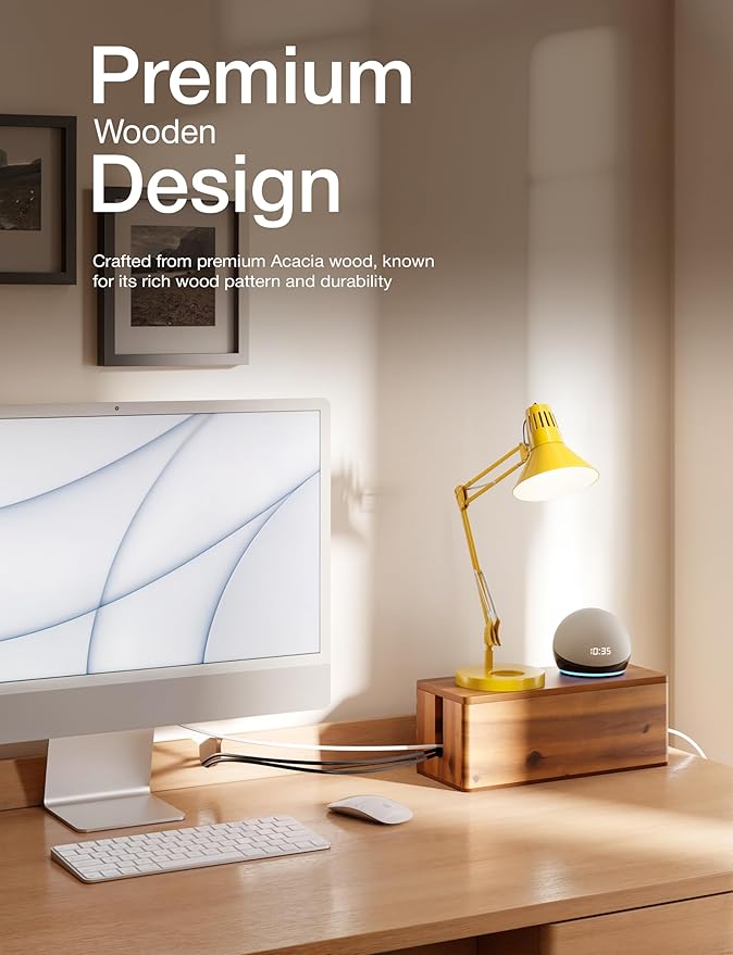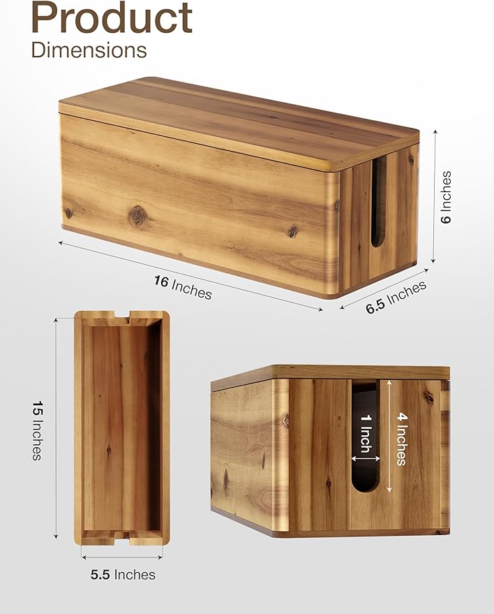 - High-Quality Acacia Wood: Crafted from durable acacia wood with a smooth natural finish, this cable management box is built to withstand daily use while adding understated sophistication to any space. Its generous 16" L x 6.5" W x 6"H size accommodates most power strips, surge protectors, and excess cables—keeping your setup tidy without taking up unnecessary room.