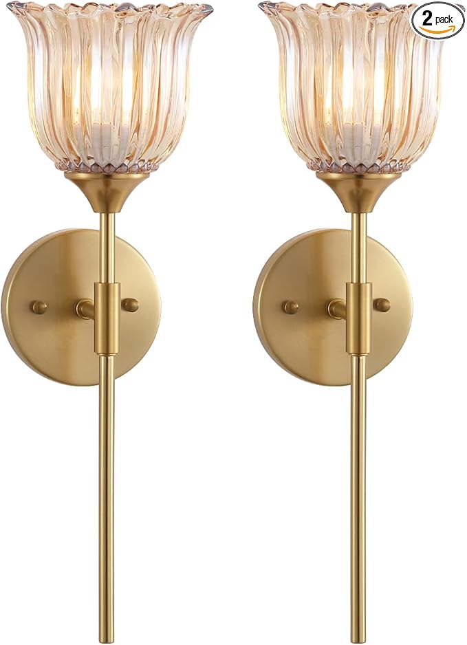 Gold Wall Sconce Set of 2 with Amber Glass Shades Modern Mid Century Bathroom Vanity Wall Light Fixtures Industrial Brushed Brass Wall Lamp for Bedroom Mirror Living Room Restaurant
