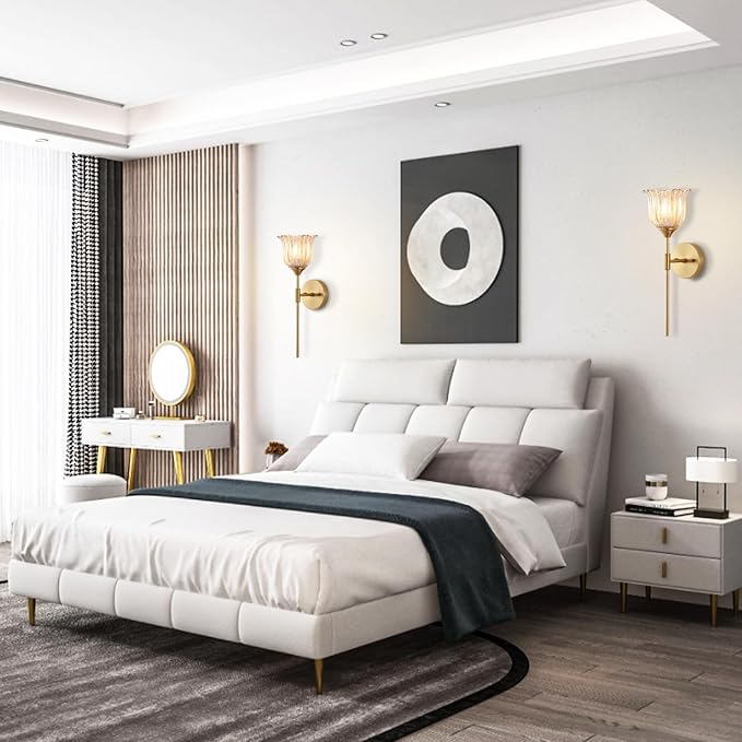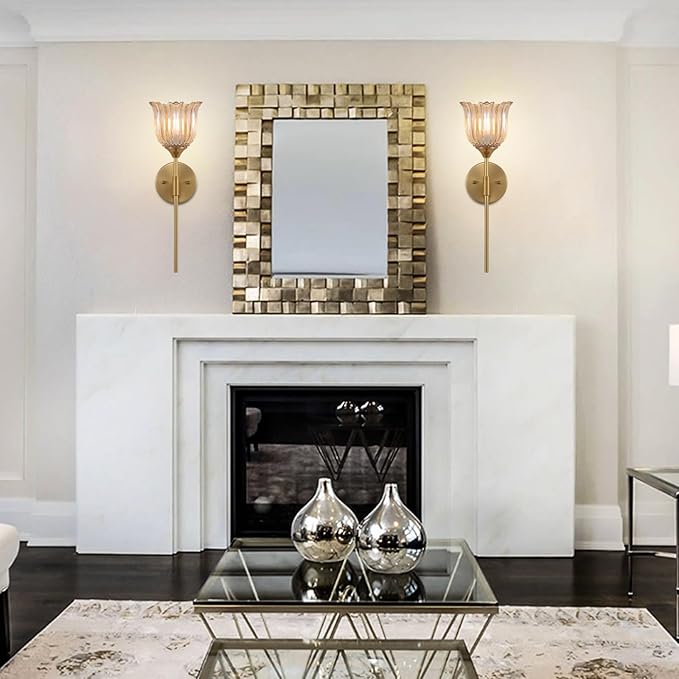 - 【Perfect Size】Wall light size:18.1'' L x 7.68'' W;Back plate size: 4.72"(D);Amber glass lampshade size:5.9"(D)*4.72"(H). The 2 Pack gold light fixture is Hard-wired,no switch or plug on the fixture itself. With USA standard installation back plate,easy to install.