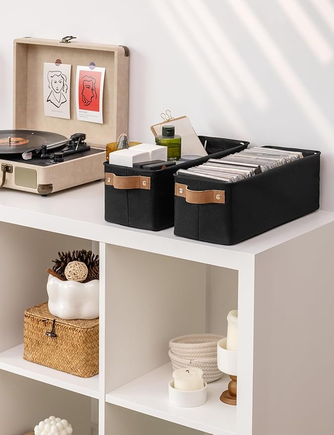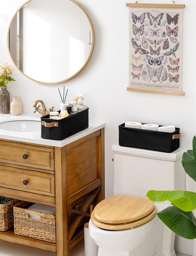 StorageWorks Narrow Storage Bins, Small Basket for Closet and Shelves, Fabric Organizer with Handles, Toilet Paper Storage, Black, 2-Pack