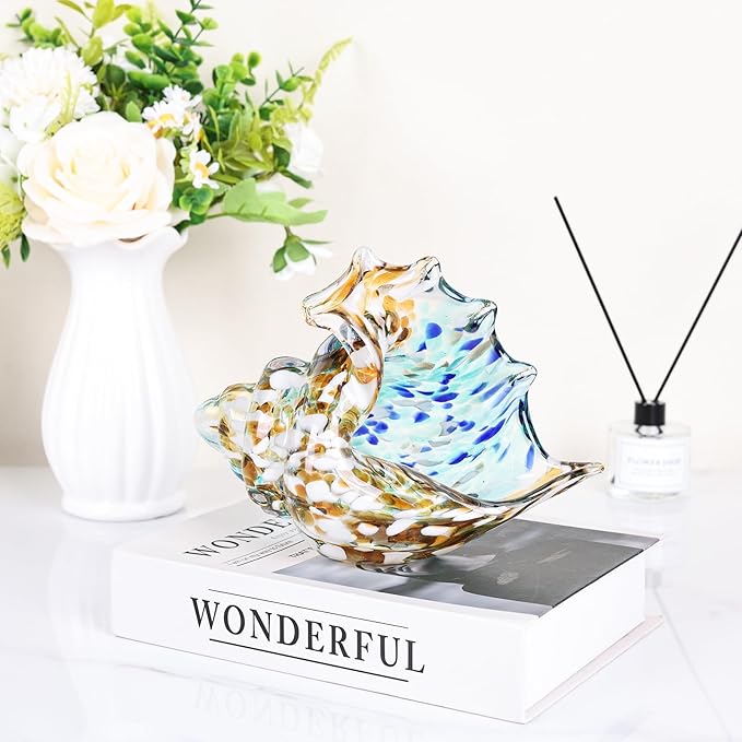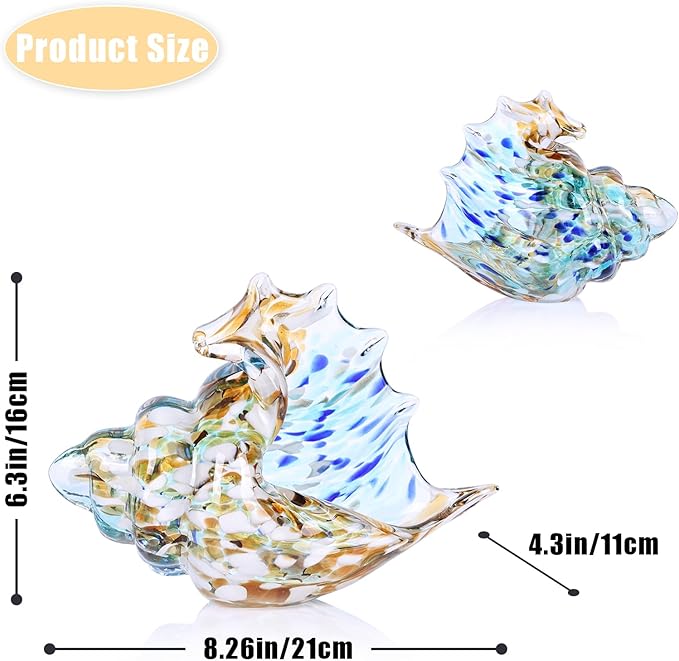 - 【Elegant Coastal Art】Capture the serene beauty of the ocean with this glass conch shell sculpture. Its intricate blown glass art design and vibrant colors make it a stunning addition to beachy decor and ideal shelf decorations for living room, adding elegance to modern and coastal interiors.