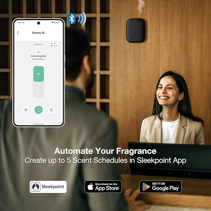 - Flexible Settings Enabled by Sleekpoint App: Download the Sleekpoint app from the Apple App Store (iOS) or Google Play Store (Android OS) and enjoy full controls over Scent XL via Bluetooth: [Power ON/OFF] Easily turn the device or booster fan on/off. [Scheduling] Set up to 5 schedules/diffusing scenes for different times and days to meet your needs for various occasions. [Diffusing Time] 3 sec - 5 min [Pause Time] 5 sec - 19 min. Please stay within 20 feet of the device to connect