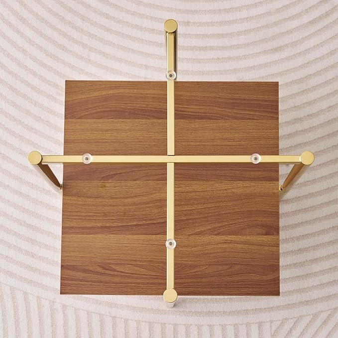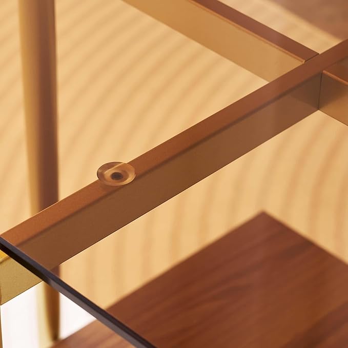 Glass End Table, Mid-Century Modern Design Sofa Table, L41 x W21 x H17, for Living Room, 2-Tier Structure, Clear Glass Top and Walnut MDF Shelf, Sleek Conical Metal Legs with Gold Finish Frame